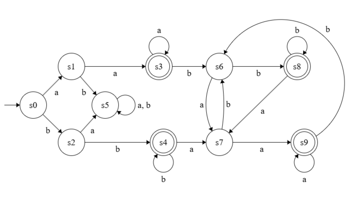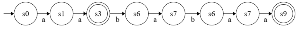 It accepts the word “aababaa” because we land on the accepting state s9 after reading the word: