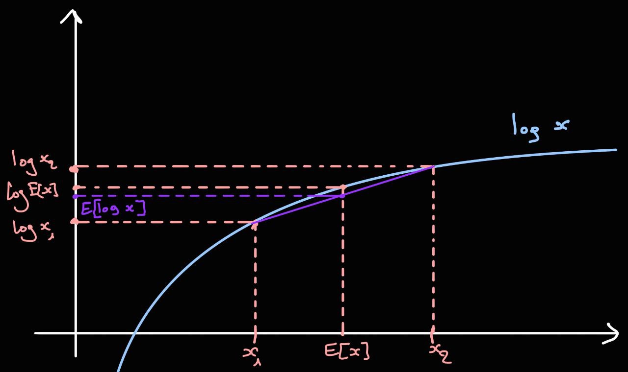 From the above derivation, we conclude that: \( \log \text{likelihood} = D_{KL} + \text{ELBO} \). ELBO is called the Evidence Lower Bound. It is called so because in the context of Bayesian inference, the (log)-likelihood corresponds to the evidence. Additionally, \( D_{KL} \) is always positive, which means ELBO is a lower bound on the log-likelihood, where \( D_{KL} \) is the gap between them. Instead of evaluating the log-likelihood (or the evidence in the posterior expression), which is intractable because it includes the integral in the marginalization expression, we use the ELBO as a proxy that tells us if we are improving. Maximizing the ELBO corresponds to minimizing \( D_{KL} \). The expression of the ELBO is: \[ \text{ELBO} = E_{z \sim q}\left[ \log \frac{p(x,z;\theta)}{q(z|x)} \right] \] For completeness, I am providing the standard way of deriving the ELBO you will find in literature and scientific texts. However, from a subjective point of view, I find this standard way pretty confusing because it uses \( q(z) \) in the expression instead of \( q(z|x) \). In this context, I don’t see the derivation as an answer for the question “how should I approximate the posterior?” but rather to a broader problem which is “how to sample \( z \)?”. (The answer to the second question is importance sampling by introducing a variational term \( q(z) \), see this lecture from 25 min for more insights). In this derivation, we start from the log-likelihood expression: \[ \begin{align*} \log p(x;\theta) &= \log \int p(x,z;\theta) \,dz \\ &= \log \int p(x,z;\theta) \frac{q(z)}{q(z)} \,dz \\ (\ast) &= \log E_{z \sim q}\left[ \frac{p(x,z;\theta)}{q(z)} \right] \\ (\ast\ast) &\ge E_{z \sim q}\left[ \log \frac{p(x,z;\theta)}{q(z)} \right] \end{align*} \] \( (\ast) \quad \) Definition of expected value for continuous functions: \( \quad \quad E_{z \sim q}[g(z)] = \int g(z) q(z) \,dz \) \( (\ast\ast) \quad \) Jensen’s inequality: for concave function \( f \) and a random variable \( Y \): \( \quad \quad f(E[Y]) \ge E[f(Y)] \)